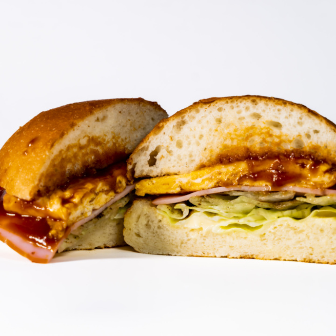 パリふわの焼きたて自家製バンズに、ハムの塩味と卵の優しい風味が絶妙に調和し、口の中で広がるやさしい味わいが魅力です。
