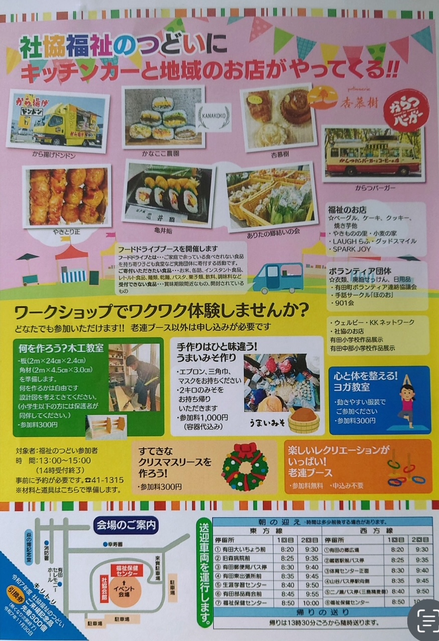 news ホームお知らせ佐賀県有田町「社会福祉のつどい」に出店します!(11/30) 佐賀県有田町「社会福祉のつどい」に出店します!(11/30) 2025.11.01 佐賀県有田町社会福祉協議会「社会福祉のつどい」~有田で生きる~期間:11月30日(日)時間:9時30分 ~会場:佐賀県西松浦郡有田町南原甲664-4(有田町福祉保健センター横)